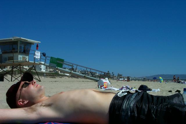 We got up today extremely late. We had agreed to sleep in, but this was ridiculous! We left the Sheraton of Industry City for good at noon, and we were off to the beach. Specifically we were headed for Manhattan Beach. I was told that it was a great beach for hanging out, sunning, and great ``scenery''. We would not be disappointed.